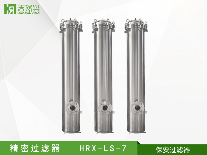 精密过滤装置(也称作保安过滤器)大都采用不锈钢做外壳,内部装过滤滤芯(例如PP棉),主要用在多介质预处理过滤之后,反渗透、超滤等膜过滤设备之前。用来滤除经多介质过滤后的细小物质(例如微小的石英沙,活性炭颗粒等),以确保水质过滤精度及保护膜过滤元件不受大颗粒物质的损坏。精密过滤装置内装的过滤滤芯精度等级可分为0.5μs,1μs,5μs,10μs等,根据不同的使用场合选用不同的过滤精度,以保证后出水精度及保证后级膜元件的安全。